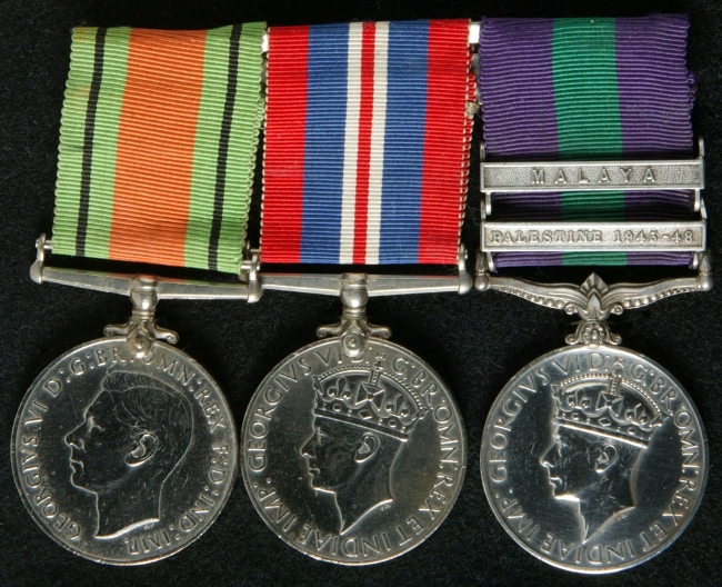 (L to R) 1939-45 Defence Medal; 1939-45 War Medal; General Service Medal 1918-62 with clasps 'Palestine 1945-48', 'Malaya'