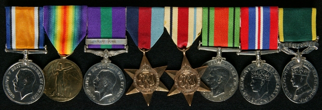 (L to R) British War Medal; Allied Victory Medal; General Service Medal 1918-62 with clasp 'Iraq'; 1939-45 Star; Africa Star; 1939-45 Defence Medal; 1939-45 War Medal; Efficiency Medal