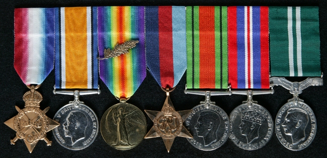 (L to R) 1914-15 Star; British War Medal; Allied Victory Medal with 'Mentioned in Despatches' oak leaves; 1939-45 Star; 1939-45 Defence Medal; 1939-45 War Medal; Air Efficiency Award