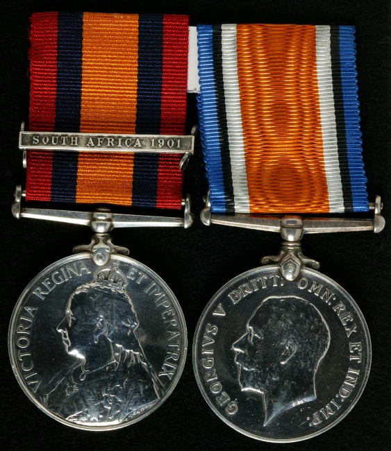 (L to R) Queen's South Africa Medal with clasp 'South Africa 1901'; British War Medal