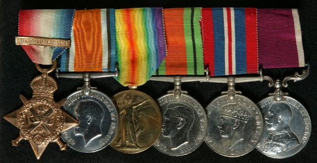 (L to R) 1914 Star with clasp '5th Aug.-22nd Nov. 1914'; British War Medal; Allied Victory Medal; 1939-45 Defence Medal; 1939-45 War Medal; Long Service and Good Conduct Medal